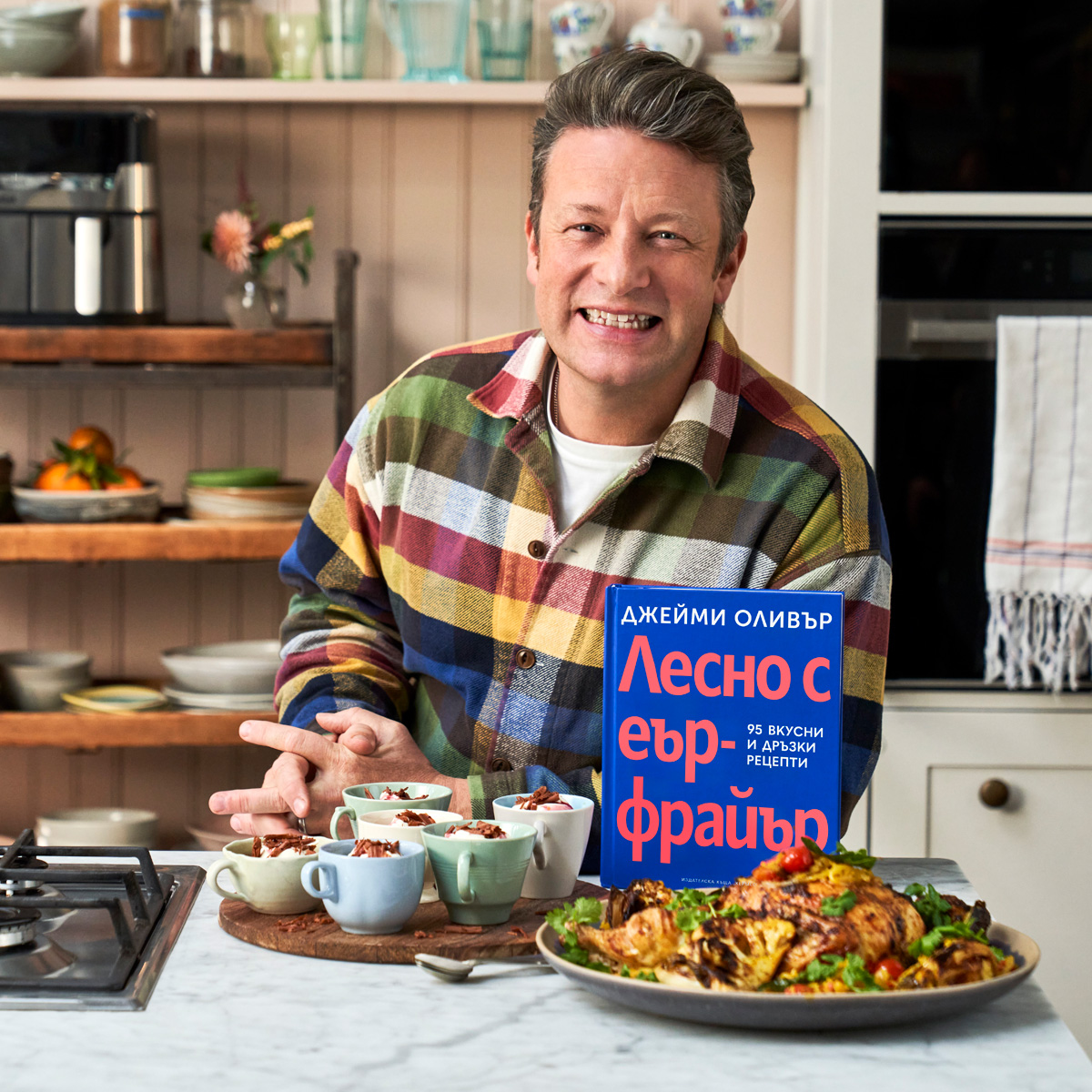 Ако искате да вкарате малко цвят в еърфрайъра си, новата книга на Джейми Оливър „Лесно с еърфрайър“ е за вас. Тя включва 95 вкусни и дръзки рецепти.